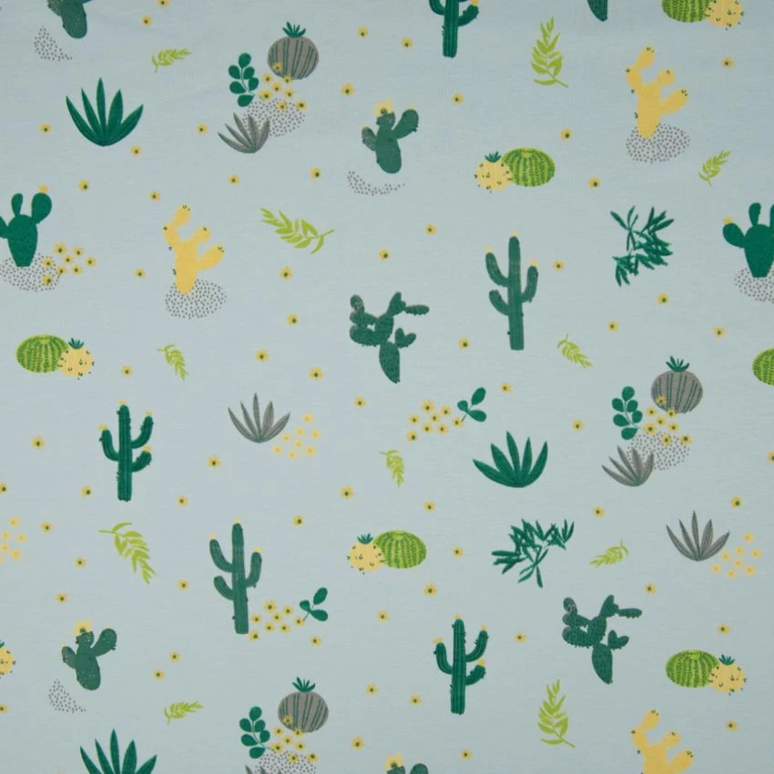 The fabric is mid-weight jersey with impeccable print quality. Extremely high cotton content ensures the fabric has a lovely feel.
