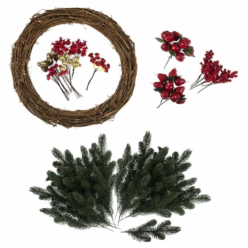 This kit contains a wreath base and all the decorations you need to create the finished wreath. The Kit includes: